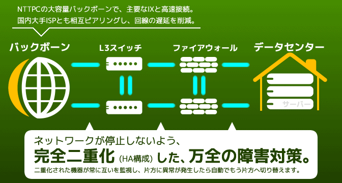 ファイアウォールや回線のトラブルによるサービス断を最小限に抑えるべく、バックボーン接続部の完全二重化を実現しています。これにより、L3スイッチ、ゲートウェイルーター、回線、ファイアウォール、いずれかの故障時には、数秒で自動的に予備設備に切り替わることで、サービス停止時間を最小限に抑えることができます。