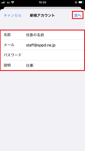 新規アカウントに、レンタルサーバー登録通知書を参考に下記のように入力し、「次へ」をタップします。