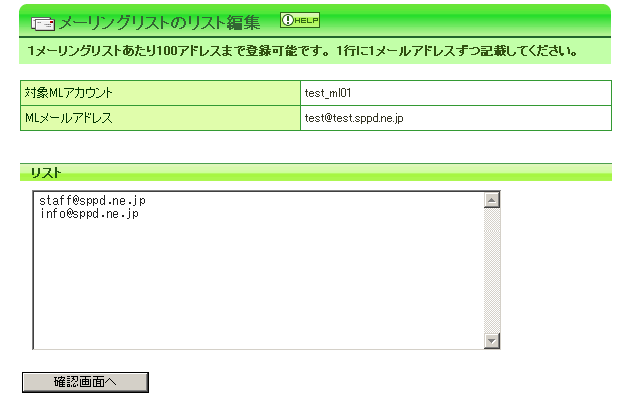 下図のように、リストに参加させたいメンバーのメールアドレスを1行に1メールアドレスずつ記載してください。入力が完了致しましたら、「確認画面へ」をクリックしますと確認画面が表示されますので、問題無ければ「変更」をクリックし、完了です。